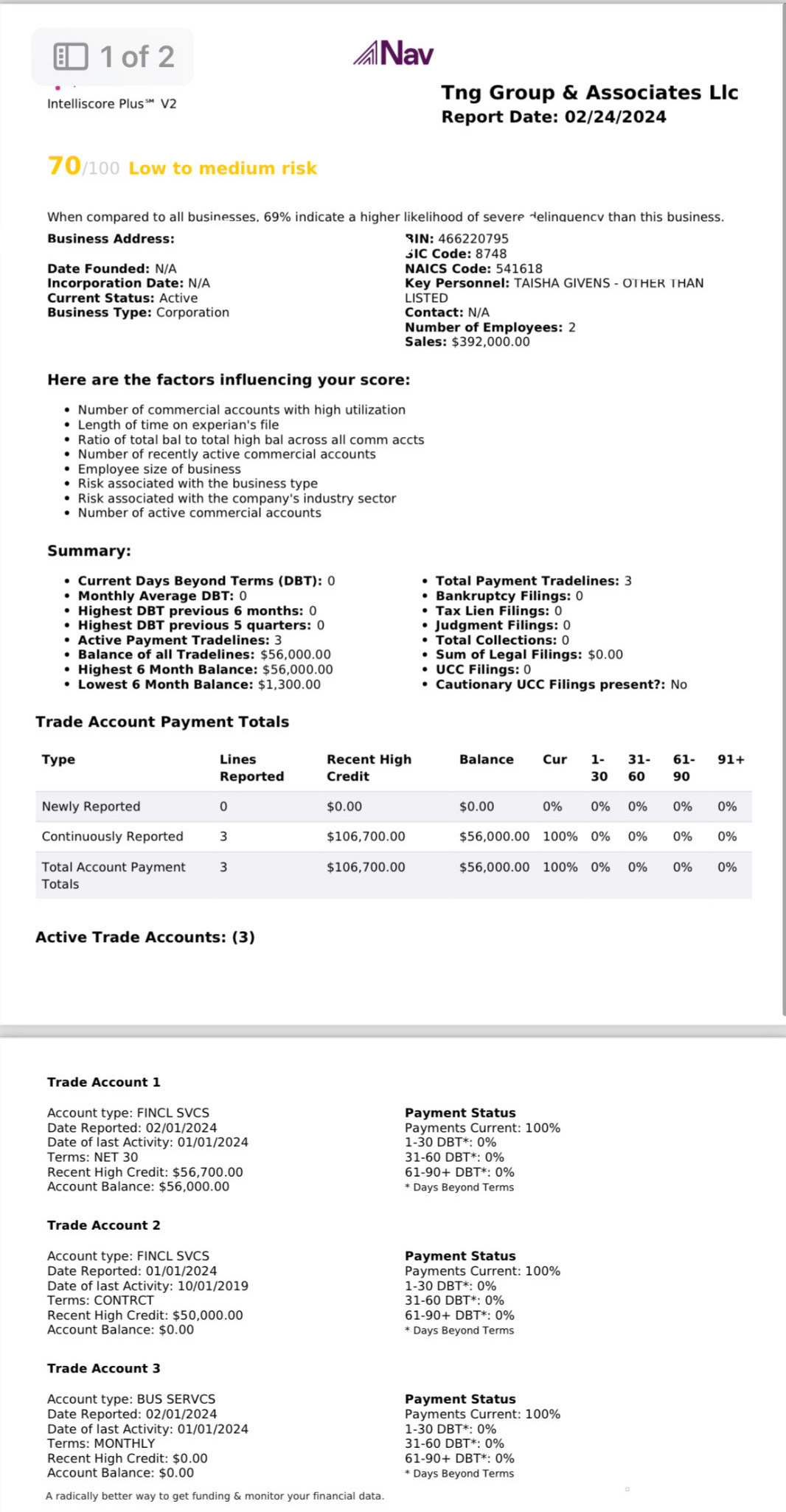 TNG GROUP & Associates LLC EXPERIAN Business Report (After car purchase) Paydex 70 out of 100. Scores were 85/100 perfect score before car purchase!