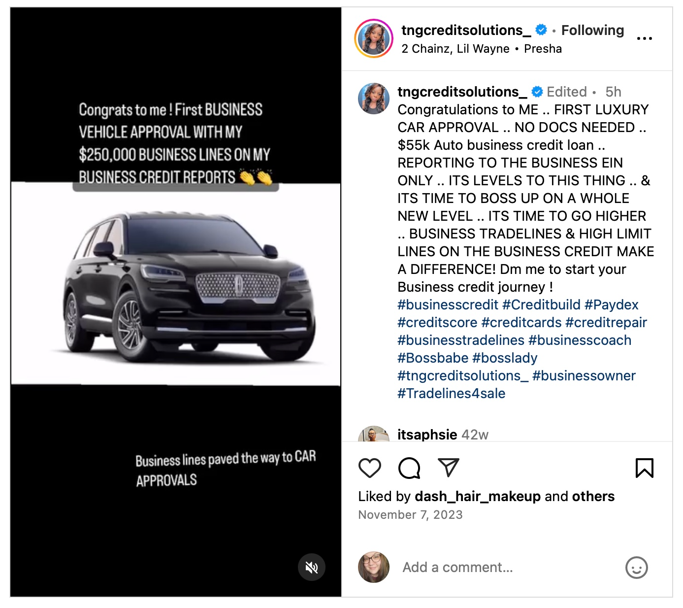 Check out TNGCREDITSOLUTIONS 1st business credit car approval in Nov 2023 here on Instagram. No doc required loan car approval- $55k!